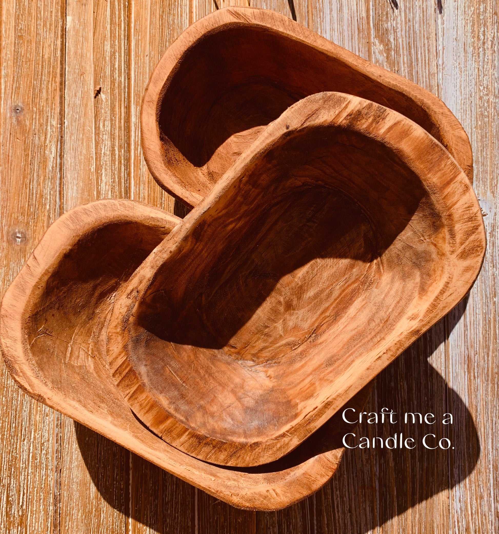 Wood dough bowl is made with Spanish Oak wood and is hand carved. Approximate dimensions are (9x5x2.5) and holds 18oz of Soy Wax.