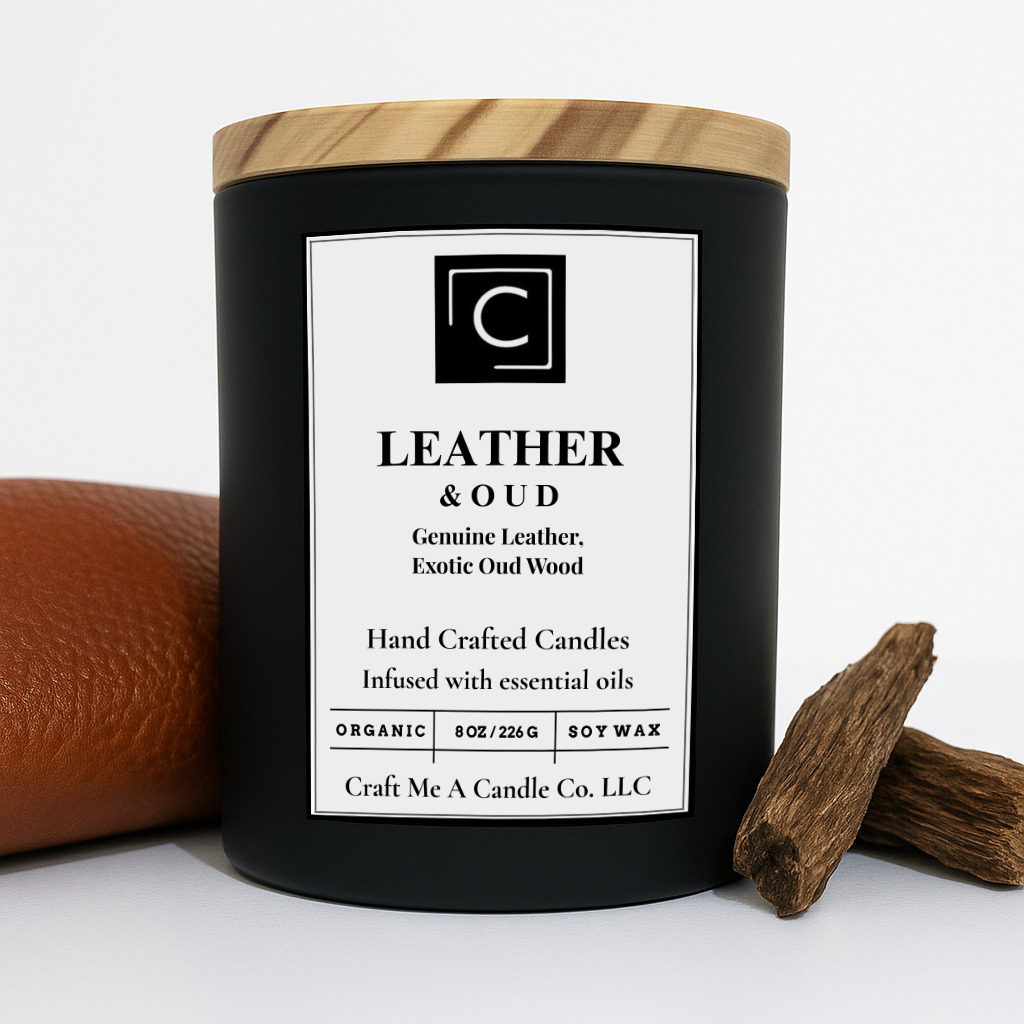Leather & Oud Scented Candle – Genuine Leather, Exotic Oud Wood | Natural Soy Wax Candles | Round Jar Candles