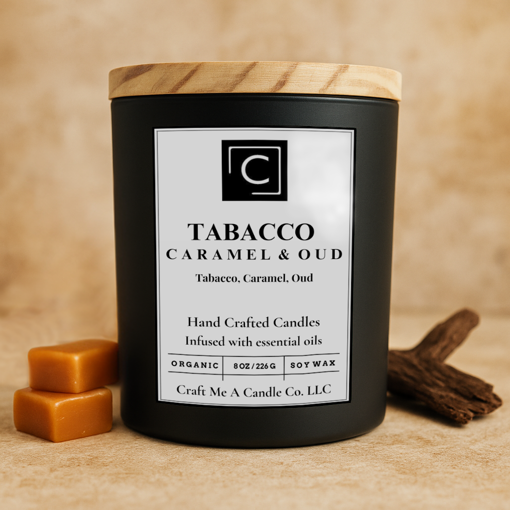 Tobacco Caramel & Oud Scented Candle – Tobacco, Caramel, Oud | Natural Soy Wax Candles | Round Jar Candles